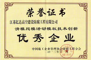 按照全国滑模工程分会评选办法,分会评审委员会对各会员单位上报的2013年度“滑模爬模活动模板技术创新优秀企业奖”等申请材料,进行了认真评审,评选出:"滑模爬模活动模板技术创新"优秀企业奖 7名,我公司江苏亿达高空建设防腐工程有限公司名列其中。