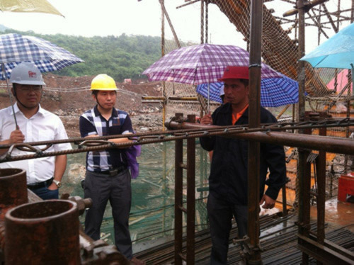 公司董事长张少荣(黄色安全帽)、项目经理吴贞诚陪同中核建设集团安徽分公司方总在施工现场我公司吴贞诚经理(黑色衣服)向中核建设集团的刘经理讲解滑模施工工艺公司董事长张少荣与中核建设集团领导在滑模施工现场技术