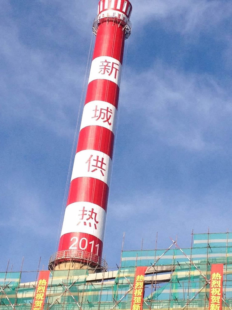 该工程为内蒙扎兰屯新城集中供热厂区的100米烟囱顶口改造项目。由于以往新建时未设置烟囱帽造型,造成烟囱外观缺陷。现甲方要求对烟囱顶部进行改造。